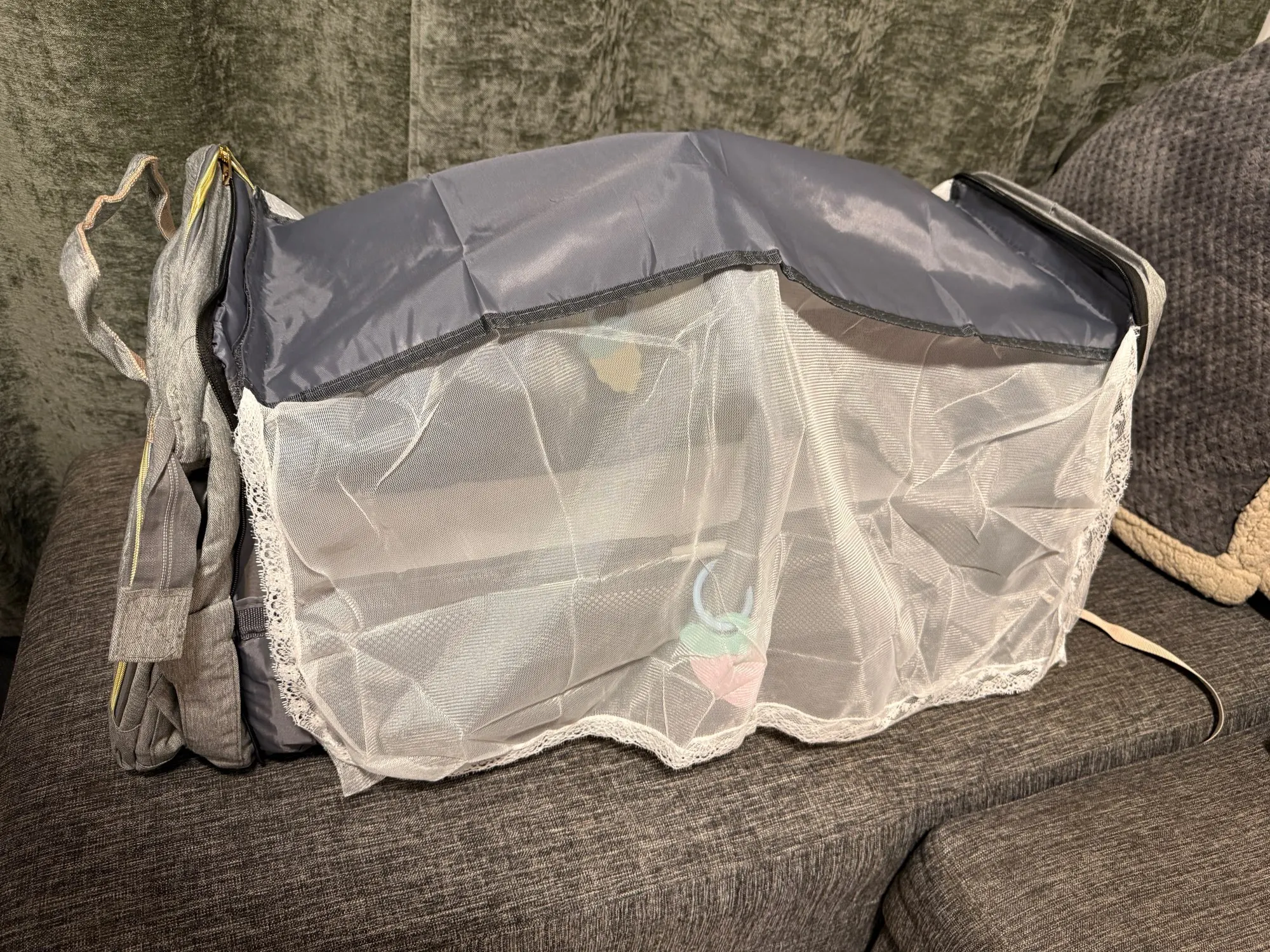 Unzips and expands into a convenient baby bed or changing area for naps and changes on the go.